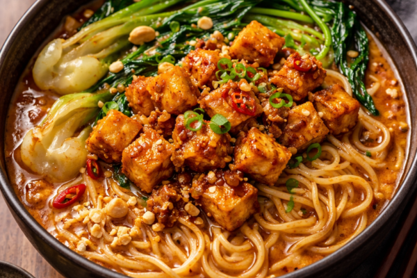Ajoutez les cubes de tofu dorés sur le dessus.